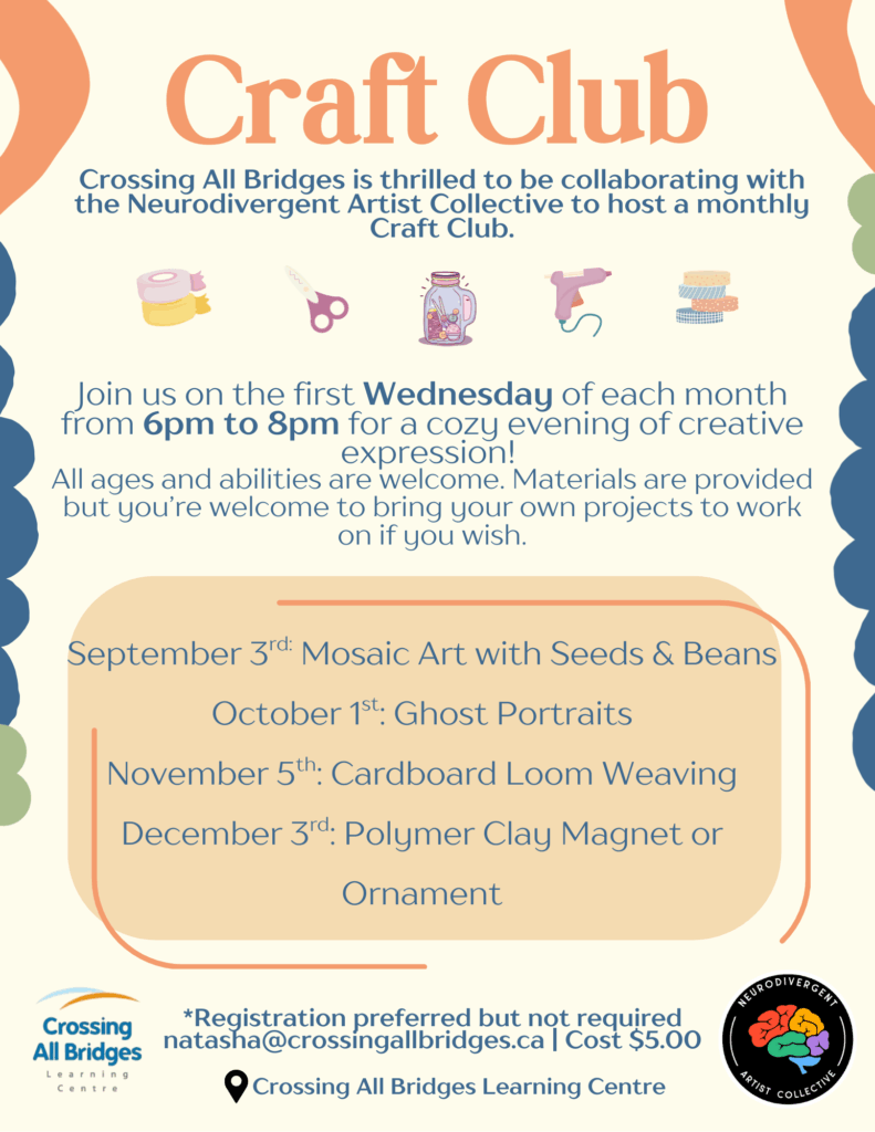 Crossing All Bridges is excited to partner with the Neurodivergent Artist Collective to bring you a cozy, creative Craft Club!