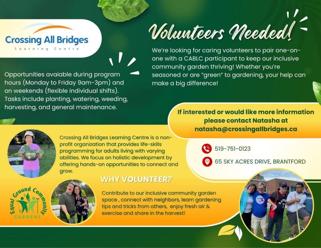 Download a volunteer application and then please contact us for an interview at 519-751-0123 or info@crossingallbridges.ca